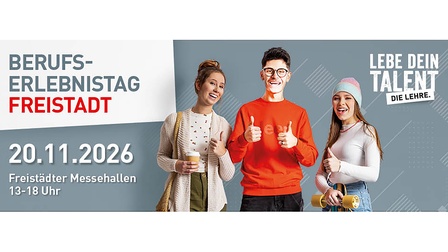 Am 20. November 2026 öffnen sich endlich wieder in den Freistädter Messehallen die Türen zur größten und wichtigsten Veranstaltung rund um Ausbildung und Berufsinformation im Bezirk Freistadt, mit über 60 Ausstellern und etwa 2500 Besucher:innen. Jugendliche und deren Eltern können sich vor Ort einen Überblick über die Berufs- und Ausbildungsmöglichkeiten in der Region verschaffen. Zahlreiche Lehrbetriebe laden bei ihren Messeständen zum Ausprobieren ein und Schulen sowie Beratungsstellen informieren über Ihr vielfältiges Angebot.